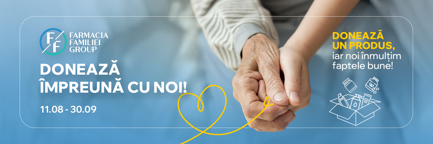 Între 11 august și 30 septembrie, cumpără orice produs de îngrijire și lasă-l în coșurile speciale din farmacii. Noi îl vom completa cu un produs similar, pentru ca fapta ta bună să se dubleze.